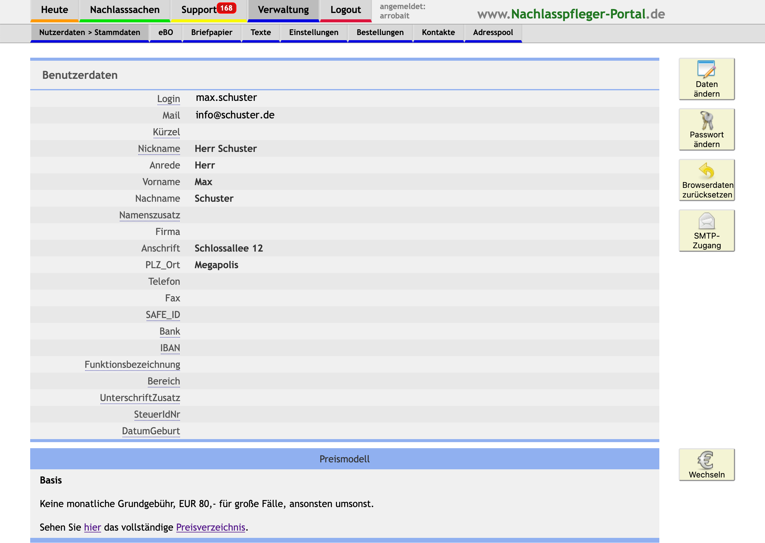 Bevor Sie hier den ersten Nachlassfall anlegen, müssen Sie zunächst die Ersteinrichtung des Portals durchführen. Dadurch werden wichtige Einstellungen vorgenommen, die sich global auf alle Nachlassfälle auswirken und steuern, wie sich das Nachlasspfleger-Portal verhält und teilweise für die Erstellung des Vergütungsantrags essentiell sind.