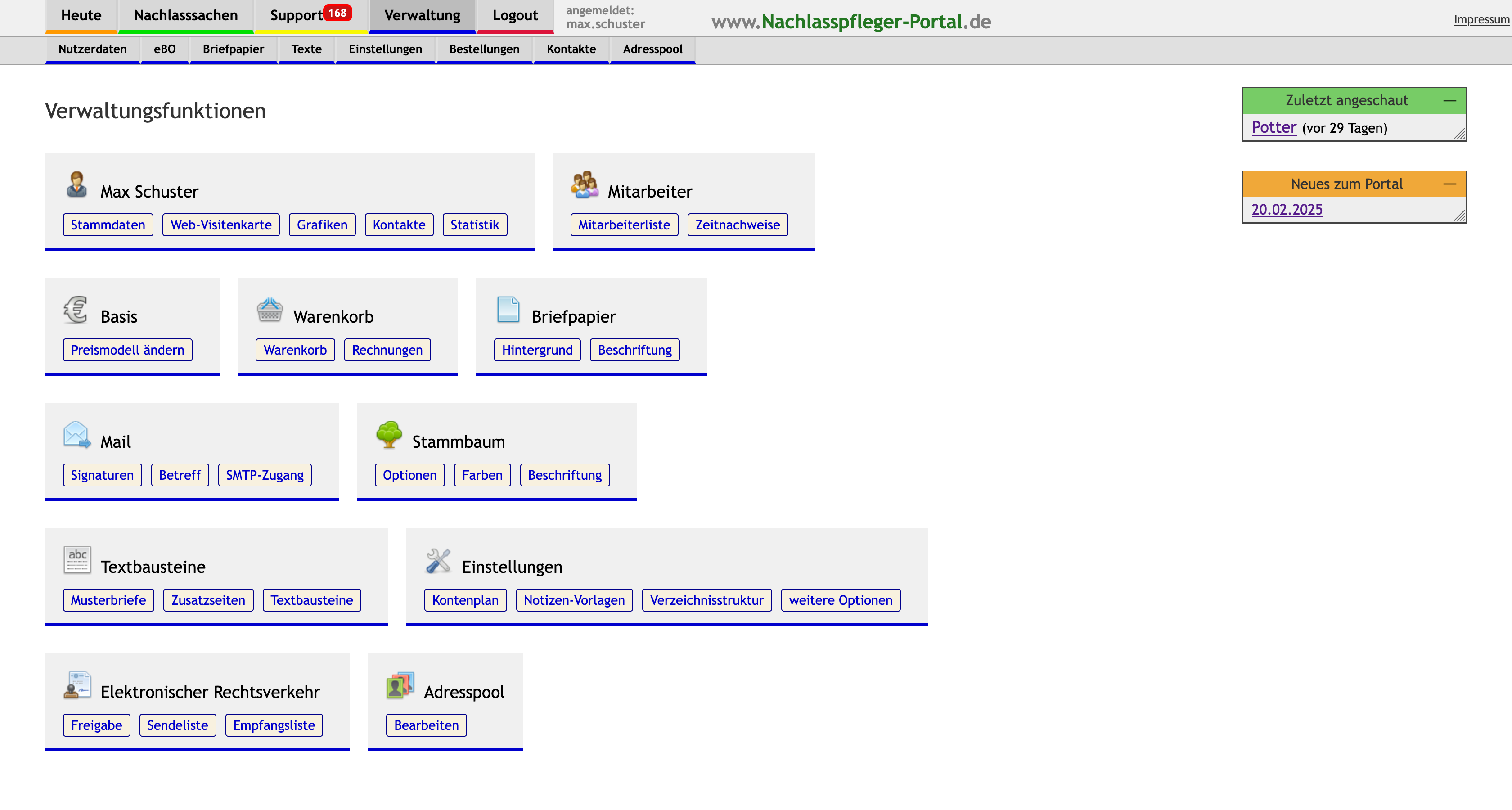 Die einzelnen Menüpunkte der Reiterleiste sind farblich abgesetzt; der offene Bereich Verwaltung, sowie alle Gruppen in dem Bereich sind blau unterstrichen. Bei den anderen Bereichen werden Sie das ebenfalls feststellen können. Sie sehen hier die Farbcodierung des Portals. Somit ist immer ersichtlich in welchem Bereich Sie sich aktuell befinden.